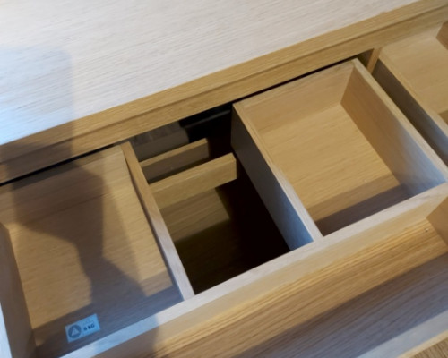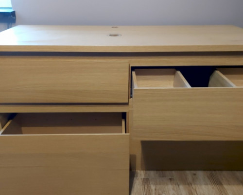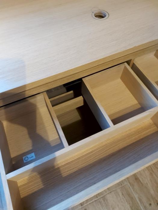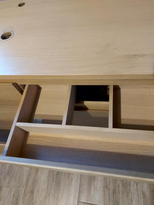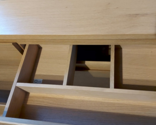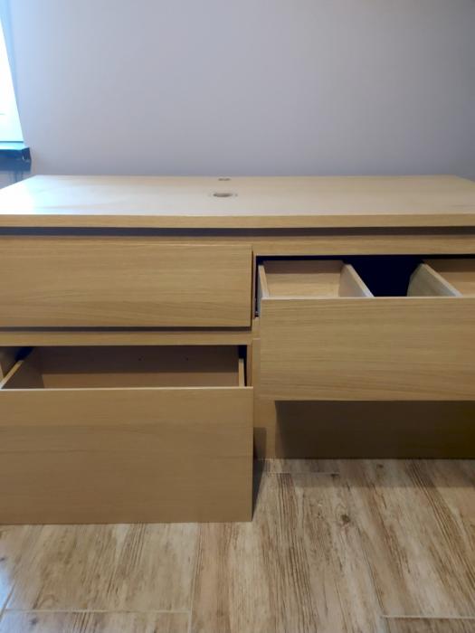Podwieszana szafka pod umywalkę z wyciętymi otworami pod miskę i baterię. 4 szuflady z przegródkami i miejscem na syfon. Ciepły , drewniany kolorze widocznymi słojami . Wymiary 120x50x65. Kupiona jako po ekspozycyjna niestety nie zmieściła się do projektu.