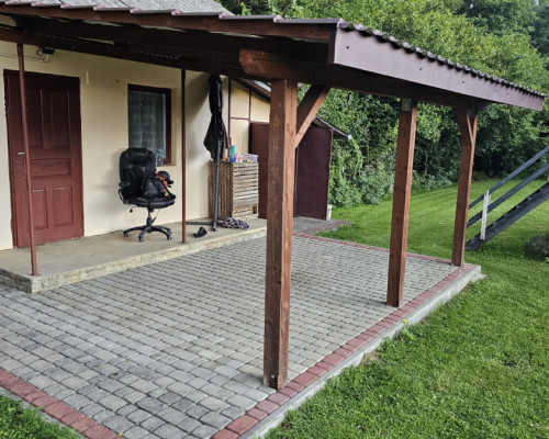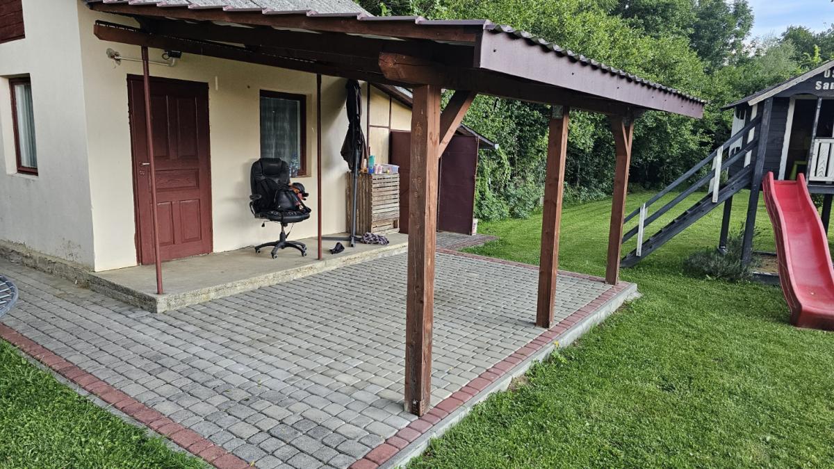 Zadaszona wiata grillowa: Wyłożona kostką, połączona z domkiem. Ratuje każde spotkanie ze znajomymi, gdy nagle złapie deszcz.