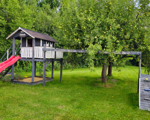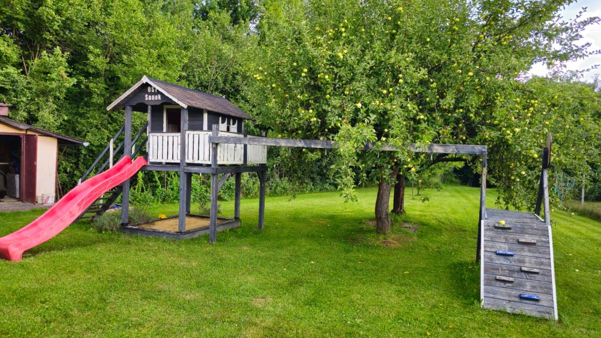 Zbudowałem świetny plac zabaw: drewniany domek, piaskownica i ścianka wspinaczkowa. Dzieciaki mają zajęcie na cały dzień.
